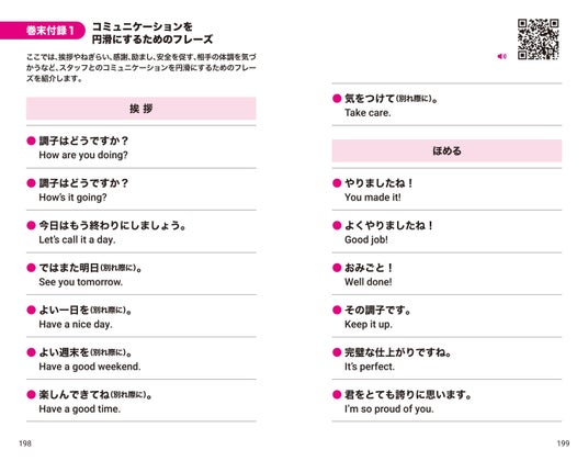 巻末には現地スタッフと円滑にコミュニケーションするためのフレーズも紹介しています。スタッフとの信頼関係を築く一助になります。