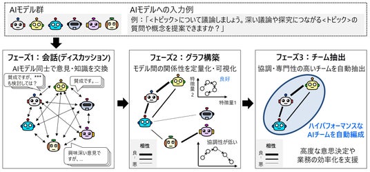 本技術では、AIモデル同士が特定のトピックについて会話し、そのやり取りからAIモデルチームを自動編成できます。具体的には、会話の噛み合い方(意味的整合性の軌跡*9)からAIモデルの協調性や専門性などのモデル間の関係性を示す特徴量を算出し、「言語モデルグラフ」として可視化・構造化します。このグラフを解析することで、人手で試行錯誤することなく、相性の良いAIモデル群を自動的に抽出することが可能です。本技術は、従来の「タスク要件から役割を決める(トップダウン型)」ではなく、「AIモデル同士の会話から相性を見極めて、タスクに適したチームを編成する(ボトムアップ型)」のアプローチであり、会話のトピックを分野や業務ごとに変えることで、必要な役割や専門性を持つAIモデルを自動的に抽出し、幅広い現場知見とAIの強みを組み合わせたAIチームを構築できます。