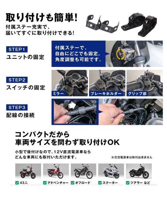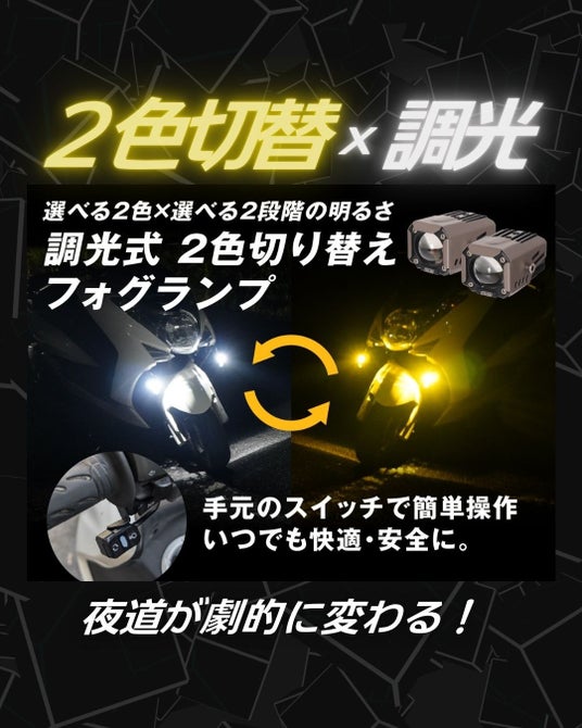 今回モニターとして提供する「バイク用 2色切り替え×調光式フォグランプ」は、以下の特徴により、ライダーの安全な走行をサポートします。