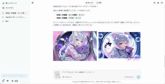 「Mio.2」では、創作の段階に合わせて2つのモードを使い分けることができます。まだイメージを固めている段階では アイデア出し でミオと一緒にブレインストーミングし、方向性が決まったら デフォルト に切り替えて画像を一括生成。複数の画像を同時に出力し、比較しながら最適な1枚を選ぶことができます。