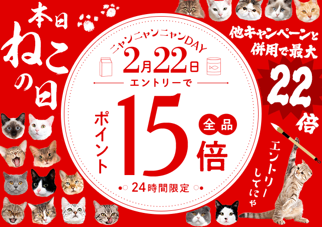 2月22日の「猫の日」は、エントリーで全商品ポイント15倍。