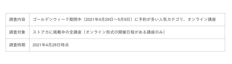 今年のGWは東京や大阪など大都市圏を中心に、再度の緊急事態宣言の真っ只中となります。外出自粛が呼びかけられる中、ストアカでもオンラインレッスン・セミナーの予約数が急上昇しています。