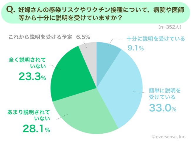 妊婦健診で定期的に病院に通っているはずの妊婦さんですが、半数の方が感染リスクやワクチン接種について病院や医師等から「あまり説明されていない」「全く説明されていない」と回答しました。「簡単に説明を受けている」と回答した人は33%いましたが、「十分に説明を受けている」と回答したのはわずか9.1%。なかなか普段の健診では、詳しく説明を受けることは難しいのかもしれません。