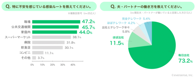 特に不安を感じている感染ルートについて聞いてみたところ、「職場」(47.2%)、「公共交通機関」(45.7%)、「家庭内」(44.0%)の順に高い結果となりました。不特定多数がいる職場や公共交通機関と同様に、家庭内感染を不安に感じている方も多くいます。夫・パートナーの働き方について聞いた質問では、73.2%が「毎日出社」と回答。コメントでも、夫・パートナーの職場からの感染に不安を感じる声が集まりました。