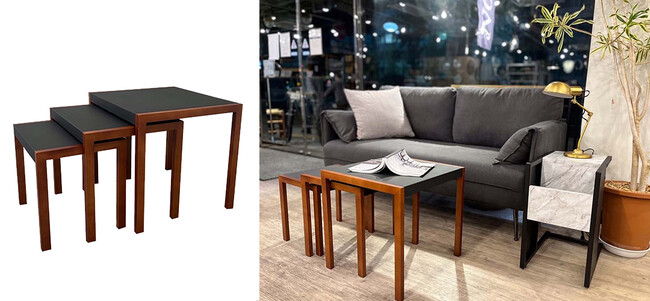 落ち着いた配色がおしゃれなネストテーブル。大・中・小サイズ3点セット。3つ横に並べて広く使用したり、別々のお部屋でそれぞれを個別で使用したり、様々な使い方ができます。天板にスチールを使用した珍しいデザインで、お部屋にさりげなく高級感を出したいに方におすすめです。