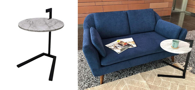 直径40cmのテーブルがついたコンパクトなサイドテーブルです。脚はまるで小鳥の足のようで、かわいらしく、天板のマーブル模様とよくあいます。要素を最低限に絞ったシンプルなデザインがスタイリッシュな印象を与えます。