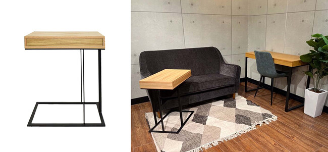 オーク天然木突板の天板とブラックスチールのコンビネーションがおしゃれな家具です。両サイドに開け閉めできる引き出しがついています。ソファの下にかませて配置できるので、ソファに座りながら使いたいスマートフォンやリモコン、コーヒーカップなど身近におきながらリラックスできます。繊細なデザインの脚は上質さを感じさせます。