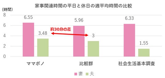 ママボノ経験者の夫の家事関連時間は1日平均3.48時間で、比較群(3.0時間)より約30分長く、社会生活基本調査の一般的な共働き世帯の夫(1.9時間)と比べても大きな差があります。
