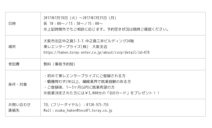 東レ株式会社100%出資会社である東レエンタープライズ株式会社(本社:東京都中央区日本橋)大阪支店/大阪人材サービス部では、繊維業界での就業経験者限定の【特別登録会】を開催致します。