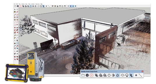 SketchUpの機能のひとつであるScan Essentialsは、Trimble X7やX9で計測した点群データをSketchUp上にインポートすることが可能です。移動&回転ツール、検査ツールや視覚化モードなどの便利な機能により点群を自在に活用出来ます。更にネイティブツールボックスで点群に直接描画・スナップして点群を正確に3Dモデルに変換、1つの平面に固定してモデリングの精度を高めます。 3Dスキャナ以外にもドローンやLIDARセンサー、モバイルマッピングから点群のインポートが可能で、ファイル形式はRWP、E57、LAS、LAZ、TZF、PLYに対応しています。