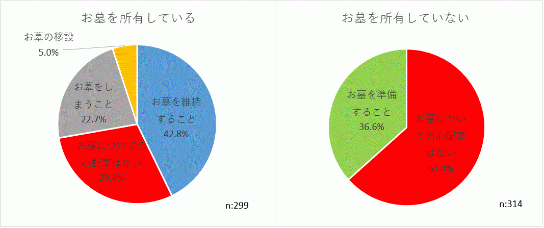 1.「老後のお墓についての心配事」ついて、“お墓を所有している人”の回答で最も多かったのは「お墓を維持すること42.8%」、次いで「お墓についての心配事はない 29.4%」、「お墓をしまう事 22.7%」と続く。「お墓の移設」と回答した方は5.0%であった。一方、“お墓を所有していない人”では、6割以上が「お墓についての心配事はない 63.4%」と回答し、残り4割弱の人が「お墓を準備すること 36.6%」と回答している。