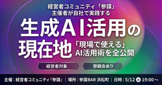 経営者コミュニティ「参謀」を運営する株式会社経営参謀(本社:東京都新宿区、代表取締役:新谷 健司)は、2026年5月12日(火)に、「生成AI活用の現在地 ~経営者コミュニティ「参謀」主催者が自社で実践する「現場で使える」AI活用術を全公開~」と題した勉強会を、参謀BAR浜松町(東京・浜松町)で開催します。本勉強会では、代表の新谷が「生成AI実践会」などの最前線で学んだ最新知見と、自社業務への具体的な落とし込み方を包み隠さず公開します。