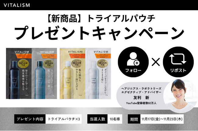 友利新がエグゼクティブ・アドバイザーをつとめる株式会社ヘアジニアス・ラボラトリーズ(本社:東京都渋谷区、代表取締役:津田知明)は、2023年11月23日(木祝)までの期間で、トライアルパウチセットのXプレゼントキャンペーンを実施することをお知らせいたします。