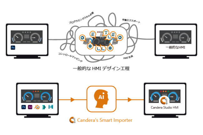 「CGI Studio」の最新バージョンである「CGI Studio 3.10」の注目機能は、「Car HMI Europe 2021」にて、自動車のHMI+UXにおける機械学習とAIの最も革新的なアプリケーション部門で第1位を受賞した「Smart Importer」です。PhotoshopやSketch、Axure RPで作成されたグラフィックスを「CGI Studio」にインポートすると、「Smart Importer」のAI機能でグラフィックスがそのまま使用できるHMIに変換されます。