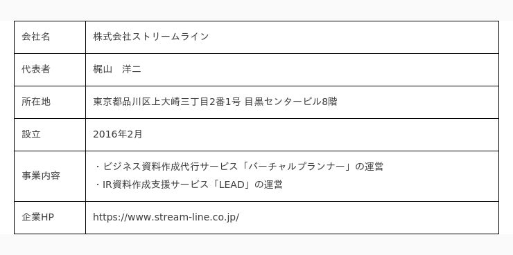 株式会社ストリームラインは、「コミュニケーションの合理化で、ビジネスを進化させる」という理念を掲げ、2016年よりビジネス資料作成代行サービス「バーチャルプランナー」を展開しております。創業から7年間で、800社以上、1,800部以上の資料作成を支援し、質の高い資料を作成することでコミュニケーションの合理化を実現し、成果を生みやすい環境を創出してまいりました。