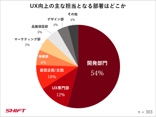主な担当となる部署はどこか:54%は「開発部門」が主体となりUX向上に取り組む