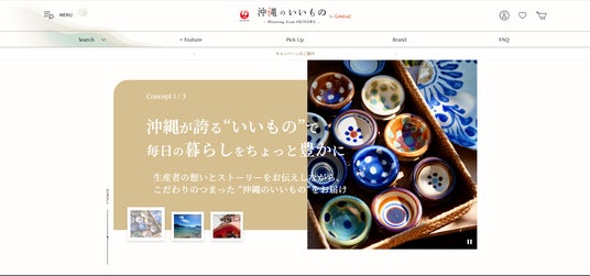 「沖縄のいいもの by Coralway」へリニューアル後は、従来の商品に加え、生産者が伝統を継承しながらこだわりを持って作りあげた様々なジャンルの“沖縄のいいもの”の販売を開始しました。トップページでは、サイトのコンセプトを最大限に表現することを最優先し、サイドメニューをあえて表示せず、関連画像やメッセージを豊富に掲載しています。さらに、アニメーションを加えることで動きを出し、コンセプトへの注目を引きやすいサイトデザインを実現しました。