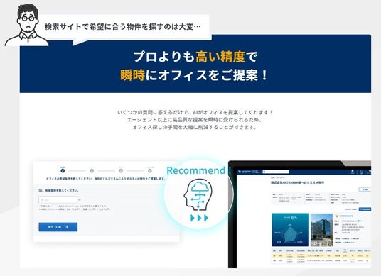 HATARABAオフィスの最大の特徴でもある「AIレコメンド機能」は、豊富な移転実績をもとに構築されたHATARABA独自のAIです。そのため、企業ごとの移転ニーズやワークスタイルに最適なオフィスを提案することができます。それにより「どの物件が自社に合うかわからない」といった課題解決のサポートを実現します。