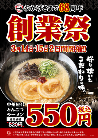株式会社ガーデン(本社:東京都新宿区 代表取締役社長:川島賢 以下「当社」)が運営する「元祖中洲屋台ラーメン 一竜」は、多くのお客様にご愛顧をいただき2023年3月に68周年を迎えます。これを記念し、2023年3月14日(火)と3月15日(水)の2日間限定で、定番メニューの「とんこつラーメン」を税込820円のところ、税込550円にて提供します。