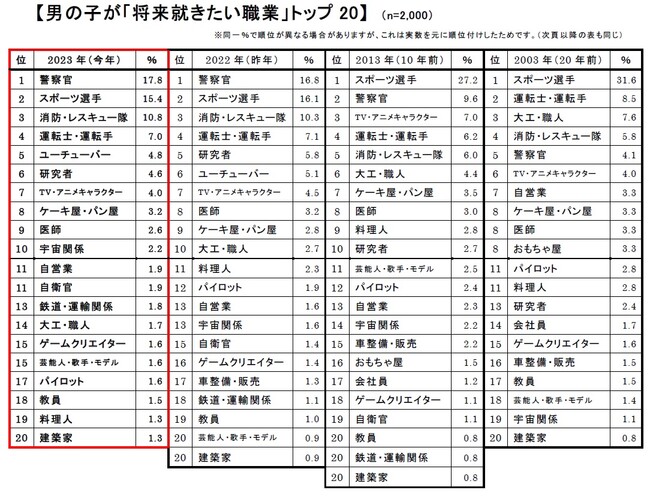 男女別に見ると、男の子の将来就きたい職業は、「警察官」が過去最高の17.8%で3年連続1位となりました。2016年に登場してから毎年順位を上げている「ユーチューバー」は、今年は5位に入りました。民間企業による宇宙開発・ビジネスが拡大する中、「宇宙関係」が初めて10位に入りました。