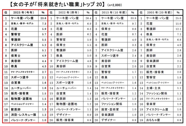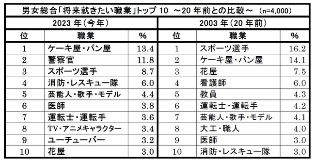 子どもの将来就きたい職業は、「ケーキ屋・パン屋」が男女を合わせた総合1位となりました。2位の「警察官」は男女両方で年々増えており、今年は1位と1.6ポイント差に迫っています。20年前(2003年)の調査と比較すると、「警察官」は約4倍、「消防・レスキュー隊」も2倍に増え、人や街を守る仕事への関心が高まっていることがうかがえました。一方で、圧倒的人気だった「スポーツ選手」は半減しました。