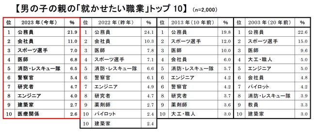 14年連続で「公務員」が1位でした。「会社員」は3年連続で2位に入り、比率は過去最高となりました。安定した職業に就いてほしいという気持ちがより強まっているようです。そのほか、「スポーツ選手」が順位を上げて3位に入っています。