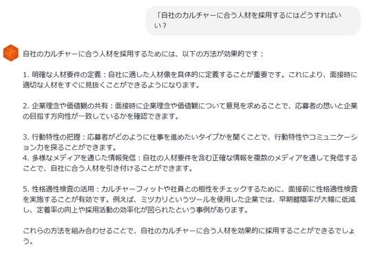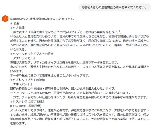 また、性格適性検査の受検者の情報をAIに読み込ませることで、性格や価値観の特性、コミュニケーションの取り方などを具体的にアドバイスします。