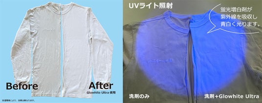 蛍光増白剤は、洗濯したりすると減少していくので、グローホワイトウルトラで衣類のホワイトニングをすると、衣類を白くきれいに長く着ることができます。