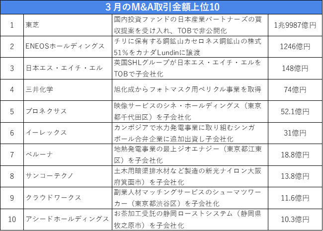 取引金額(公表分を集計)は2兆1646億円となり、東芝の非公開化を目的とするTOB(株式公開買い付け)が2兆円規模に達し、金額が跳ね上がりました。ただ、東芝案件を除けば、年初来、件数の割に金額が伸び悩む傾向が続いています。