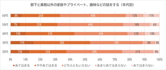 年代別に見てみると、「あてはまる」「ややあてはまる」の回答は30代が5割以上でトップとなり、50代が約3割で最も低い結果に。30代は「あまりあてはまらない」「あてはまらない」の回答の合計も少なく、部下とのコミュニケーションにおいてプライベートや趣味の話題を積極的に交わしている傾向がうかがえる。
