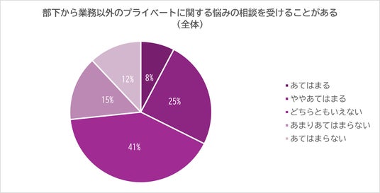 「あてはまる(8%)」「ややあてはまる(25%)」と回答した割合は合わせて33%であった。設問7「部下から業務に関する悩みの相談を受けることがある」の43%と比較すると、10ポイント以上低い結果となった。