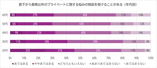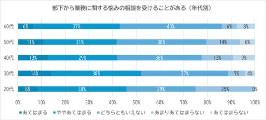 年代別に見てみると、「あてはまる」「ややあてはまる」を足した割合が最も多かったのは30代で半数以上となった。また全年代において、4割以上のマネジメントが業務に関する悩み相談を受けている結果となった。