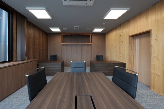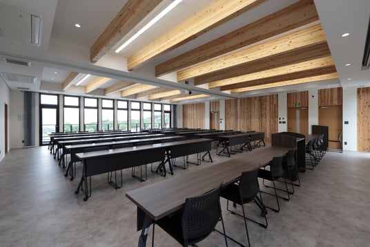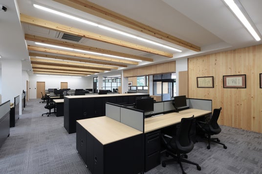 CLTパネルの設置枚数を抑え、大空間を可能とする本工法の特性を活かし、本社屋2階の会議室では柱のない大空間を実現しました。また、大断面集成材を用いた梁や、耐力壁として使用したCLTパネル等には現し仕上げを積極的に採用。木材本来の質感や香りを活かすことで、室内の温度・湿度の変化を緩やかにし、快適性と機能性を兼ね備えた社屋に仕上がりました。