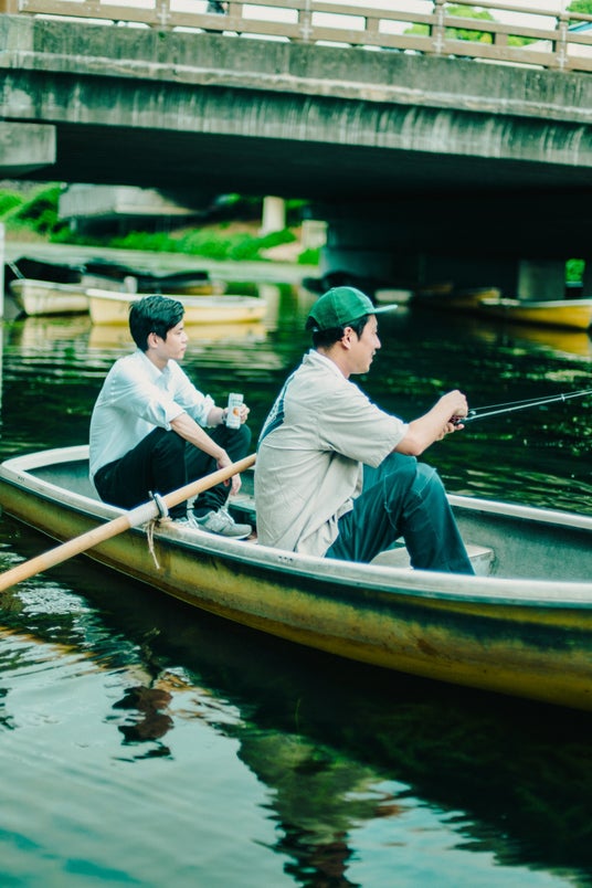 中禅寺湖でトラウトフィッシングをするショータ・ジェンキンス氏(左)とイヨシ釣り部長 小林(敏)