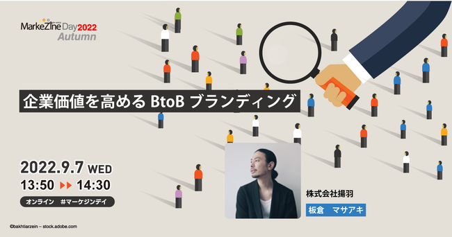 コーポレートブランディング支援を行う株式会社揚羽(東京都中央区八丁堀2丁目12-7 代表取締役社長 湊剛宏 以下、揚羽)は、2022年9月7日(水)に、株式会社 翔泳社 MarkeZine編集部主催の「MarkeZine Day 2022 Autumn」に登壇いたします。「企業価値を高めるBtoBブランディング」をテーマに、弊社のブランディングコンサルタント / クリエイティブディレクター 板倉マサアキが、組織と従業員が一体となって、企業価値を高めるためのブランディングプロセスの設計方法や成功事例をお伝えします。