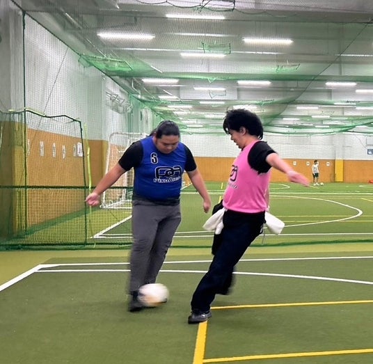 フットサルで楽しもうの約束は「自分のペースでOK!」「お互いに応援しよう!」「目的は楽しむこと」最初の自己紹介では、これからチャレンジしたい事、みんなにおすすめしたい自分のお気に入りなど休日の過ごし方やお仕事の事などを紹介し合いました。楽しみながら身体を動かす事や、コミュニケーションを通じて心身の健康増進、毎日の活力に繋げていきたいと考えています。