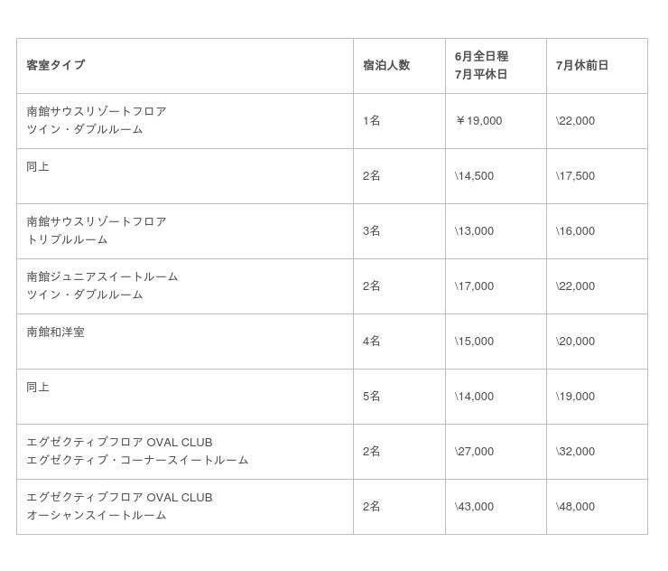料金;1泊朝食付き お1人さまあたり(税金・サービス料込)