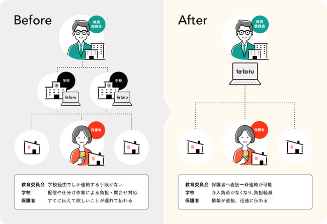 tetoruを通して、教育委員会から管轄内の公立小学校・中学校などに在籍する児童生徒の保護者に対して一斉連絡ができるようになります。
