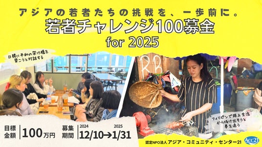 認定NPO法人アジア・コミュニティ・センター21(略称:ACC21、代表理事:長畑誠)は、本年12月10日から来年1月31日まで、寄付サイト「コングラント」を通じて目標金額100万円の「若者チャレンジ100募金 for 2025」キャンペーンを実施し、アジアの若者たちの挑戦を前進させるための活動資金を募ります。