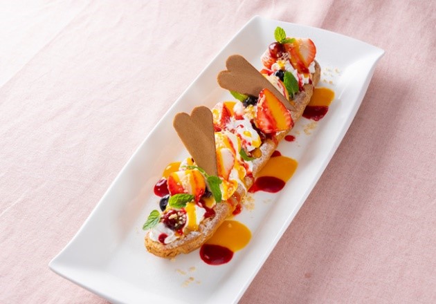 長さ約28cmもあるエクレアにたっぷりのクリームとフルーツを贅沢に盛り付けた、幸せを運ぶ華やかなスイーツ。ハートのクッキーがかわいらしく、眺めるだけで笑顔になれます。