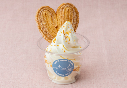 ハート型のサクサク淡路玉ねぎパイとフライドオニオンの香ばしさが絶妙にマッチした、匠牛乳のソフトクリーム。淡路島の選ばれた酪農家13軒だけの生乳を使用し、フレッシュ。