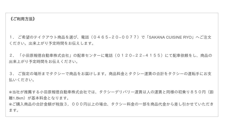 株式会社ドリームサークル(本社:神奈川県小田原市、代表取締役社長:立山昭憲)※は、神奈川県小田原市で海の幸を中心にこだわりの小田原料理を提供する『SAKANA CUISINE RYO』において、小田原報徳自動車株式会社の協力のもと、タクシーデリバリーを開始いたしました。電話にて注文いただいた商品を配車したタクシーによってご指定の場所までお届けするサービスで、ご注文の商品料金とタクシー運賃でご利用いただけます。