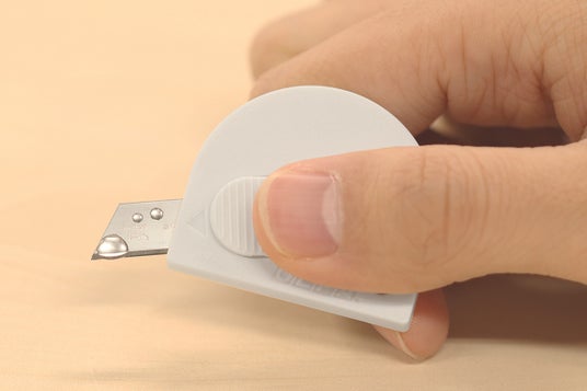 スライダーを押しているときだけ刃が出て、スライダーから手を離すとバネの力によって自動で刃が戻る安心設計です。スライダーをストッパーまで押し込むと、刃を出した状態で固定することもできます。