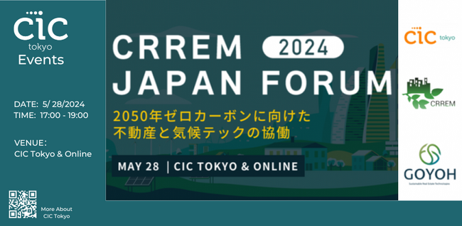5月28日(火)、CIC Tokyo(虎ノ門ヒルズビジネスタワー15階)にて、株式会社GOYOH、CIC Tokyo 環境エネルギーイノベーションコミュニティ(E&Eコミュニティ)、CRREM(Carbon Risk Real Estate Monitor)は、ハイブリッドセミナー 「CRREM Japan Forum 2024:2050年ゼロカーボンに向けた不動産と気候テックの協働」 を開催します。