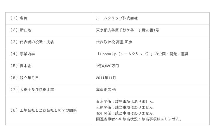 いつもキャピタル株式会社が、ルームクリップに対して出資を行います。なお、出資額、出資比率および 諸条件につきましては、公表を差し控えさせていただきます。