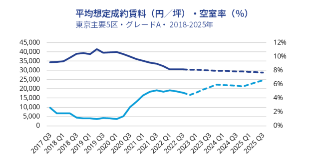 2022 年 7~9 月期の東京都心 5 区の賃貸オフィス市場では、大型の新規供給があったものの、回復傾向にある需要に支えられ、空室率は小幅ながら低下しました。賃料水準は概ね横ばいで推移しています。しかし、2023 年には 2022 年の 3 倍以上の新規供給が予定されており、円安や物価上昇に伴う景気 の不透明感も漂うなかで、短期的には空室率、賃料ともにトレンドの反転は見込みにくい状況です。