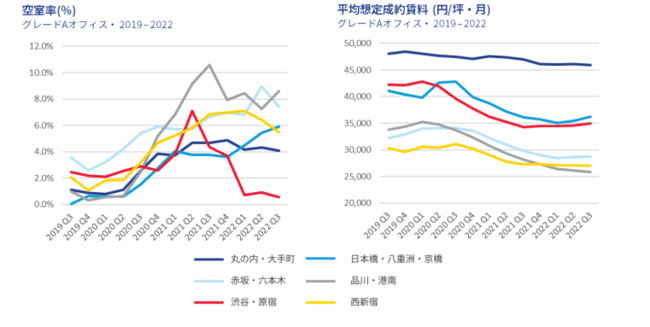 一方で、7~9 月期のネットアブソープション※2は新規供給量を上回り、空室率は小幅ながら低下しました。全体として、需要は回復傾向にあり、 2022 年前半までは新規供給量が少なかったことに加え、これまで低調だった大型のテナントに動きが出始めたことから、一部で既存の大型の空室の埋め戻しが進んだことが寄与したものと考えられます。