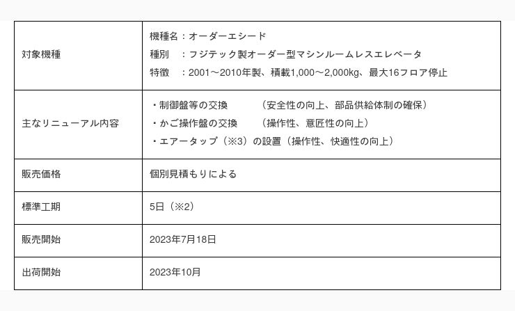 フジテック株式会社(本社:滋賀県彦根市、社長:原田政佳)は、当社製の大型エレベータ向け「制御盤交換パッケージ」を7月18日に販売開始しました。「制御盤交換パッケージ」は従来から販売していますが、今回、大型エレベータに適用し、商品ラインアップを拡充しました。本商品により大型エレベータの機種においても、短工期・低コストかつ、環境負荷の少ない工法でリニューアルが可能となります。大型エレベータ向けを追加したことにより、すべての当社製エレベータに「制御盤交換パッケージ」が対応できるようになりました。