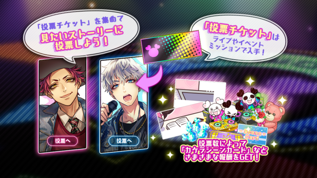 また、投票期間中はライブやイベントミッションのクリア報酬から獲得できる「投票チケット」を集めて投票を行うと、投票数に応じた報酬アイテムが獲得できますので、ぜひご参加ください!