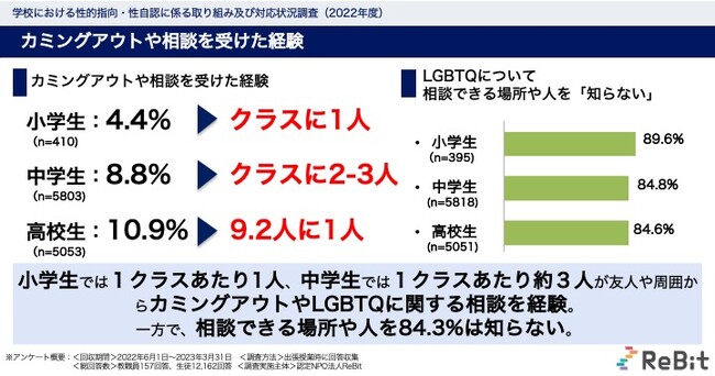 子どもたちのカミングアウトやLGBTQに関わる相談を受けた教職員のうち「適切に対応できた」と回答した教職員は僅か18.6%であり、現状では教職員が安心して相談できる相手になれていない状況も明らかになりました。また、小学校のクラスに1人以上、中学校のクラスに約3人はLGBTQからのカミングアウトや相談を経験しています。一方で、子どもたちの84.3%は、身近でLGBTQについて相談できる人・場を知らず、支援体制は十分ではありません。